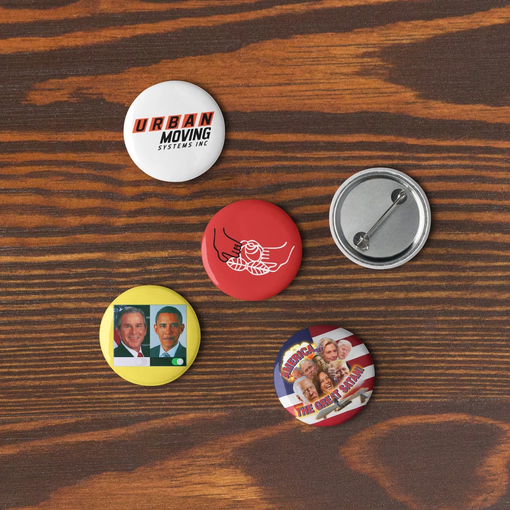 • This set features the "Dark Mode", "America... the Great Satan!", "I Voted", "DSA", and "Urban Moving Systems" designs.
